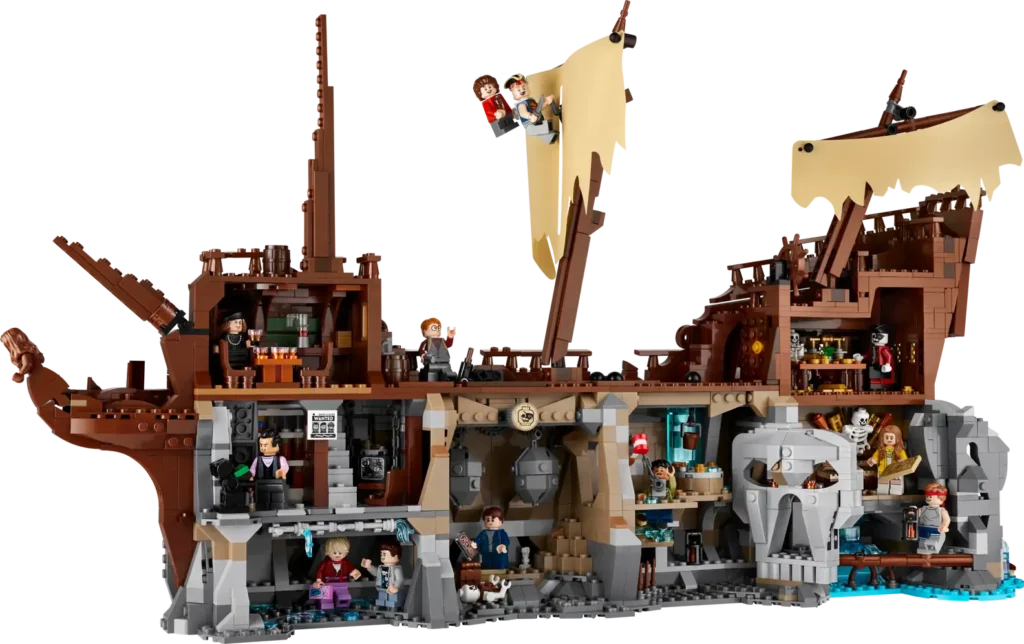 Het model zelf is een slim ‘dubbeldiorama’. De achterkant toont het indrukwekkende piratenschip The Inferno, maar de voorkant onthult het volledige avontuur in de grotten eronder. Hierdoor kunnen bouwers de film van scène tot scène naspelen. De set zit boordevol interactieve ‘booby traps’, zoals een vallend rotsblok en een valluik, en bevat natuurlijk het iconische skeletorgel.