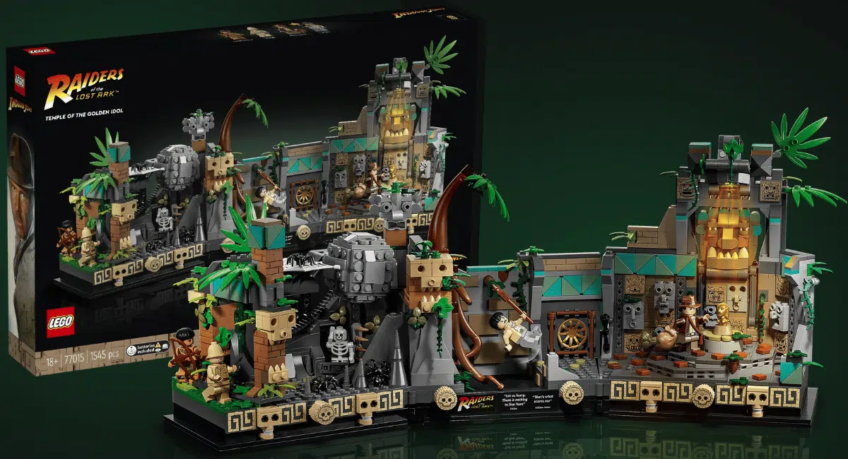 LEGO set 77015 Temple of the Golden Idol bevat 1.545 onderdelen en vertelt de openingsscène van Raiders in drie modules: de spinnen en de rotsbal, het gouden beeld met instortende muur, en de ontsnapping met Indy’s zweep.
