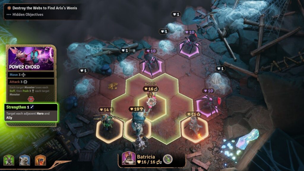 Dat begint bij het slimme ontwerp. Elke speler gebruikt zijn telefoon als character sheet: je kaarten, stats en inventory staan overzichtelijk en privé op je eigen scherm, terwijl de tv het speelveld toont – een helder hex-grid met je team en de vijanden. Het is eenvoudig, maar precies goed. De echte vondst is de dynamiek zonder vaste beurtvolgorde. In plaats van om de beurt te wachten tot je eindelijk iets mag doen, ben je voortdurend met elkaar in gesprek: “Ik kan die ogre weghalen, maar dan moet jij die rampager afmaken voordat hij de poort bereikt.” Het voelt als gezamenlijk puzzelen, niet als beurtjes afwachten. Deze speelstijl komt dan ook overeen met hoe je te werk gaat in Gloomhaven of Frosthaven. Geen zogenoemde Quarterbacking (1 speler die de rest verteld wat er moet gebeuren); want dat kan nu gewoonweg niet, omdat die ene speler niet weet welke krachten zijn/haar medespelers heeft.